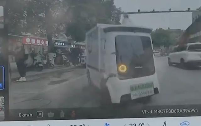 沈先生以为无东说念主车停驻了,才把车开出车位。成果刚开出一半,无东说念主快递车就撞到了前车门上。