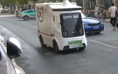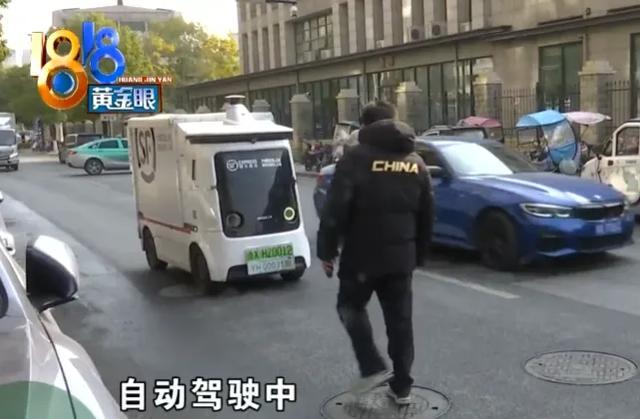 记者在采访经过中,在该路段尝试站在无东说念主快递车前线,快递车减慢泊车。