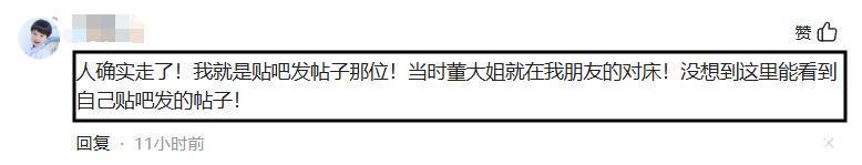 在此次董立范被曝离世的音问激励温煦后,该网友再度现身,直言“东谈主照实走了!我便是贴吧发帖子那位!其时董大姐就在我一又友的对床!没念念到这里能看到我方贴吧发的帖子!”