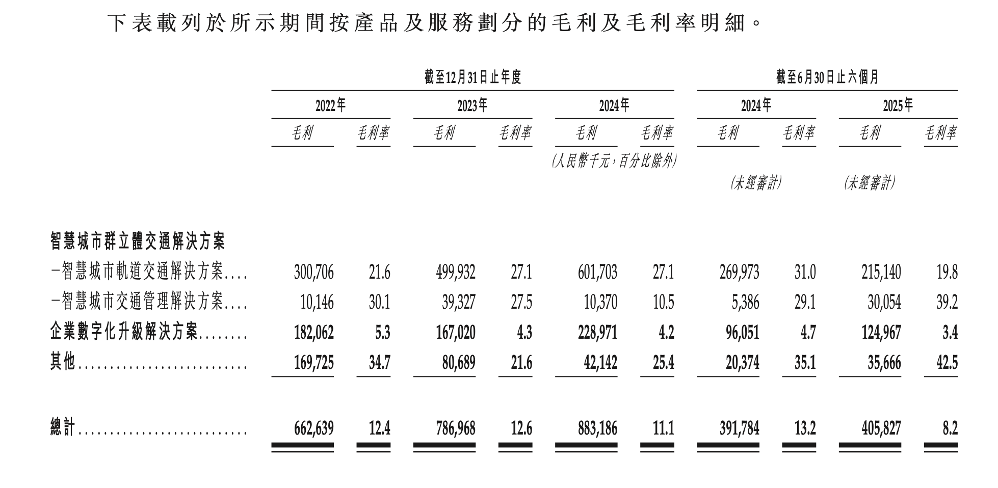 佳王人科技构建了以颖慧轨说念交通和颖慧城市交通为中枢的业务体系,并延长出企业数字化升级奇迹。可是,从连年公司业务结构的变化不错看出,低毛利业务占比正握续提高。招股书高慢,2025年上半年,公司合座毛利率大幅着落至8.2%。