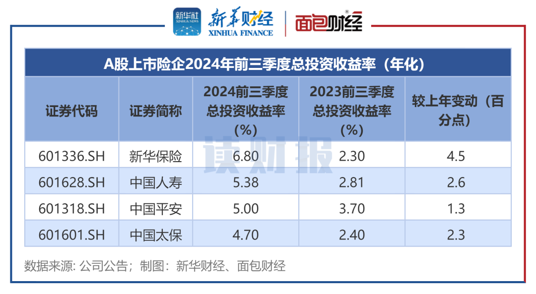 总投资收益率方面(年化,下同),2024年前三季度,新华保障、中国东谈主寿、中国吉利、中国太保总投资收益率均杀青增长。
